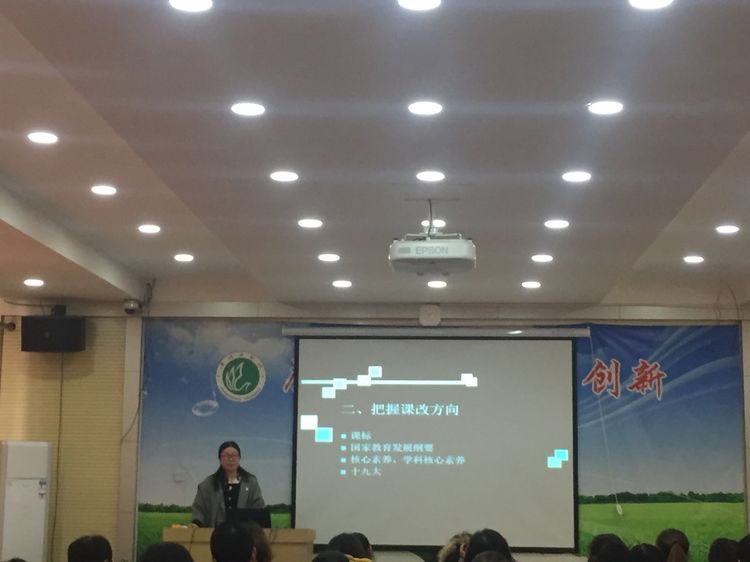 艾彦丽老师在授课过程中指出把握课改方向,要坚持做好以下四点。第一点:课标。第二点:国家教育发展纲要。第三点:核心素养,学科核心素养。第四点:深入贯彻十九大精神。