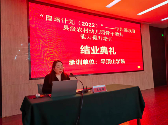 2023年3月20日,伟的国际1946bv官网“国培计划”(2022)——中西部项目·县级农村骨干教师能力提升培训班(幼儿园教师)结业典礼在香山大酒店三楼会议室隆重举行。伟的国际1946bv官网副经理王秋歌出席并主持结业典礼。班主任陈丽媛、彭鹏、申洪莹以及来自平顶山市和南阳市的99名学员参加本次典礼。