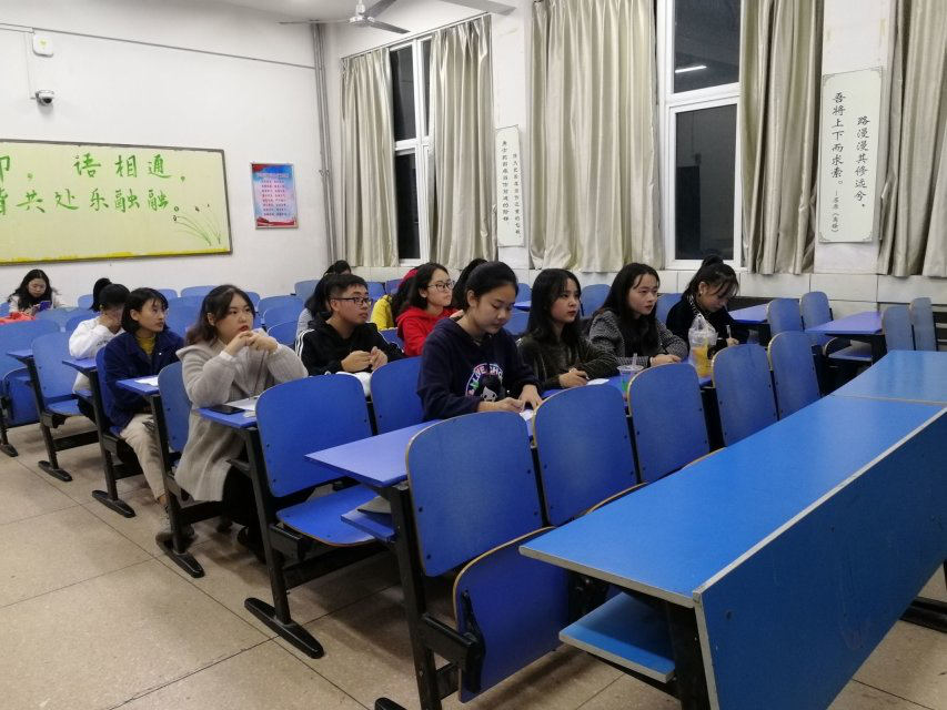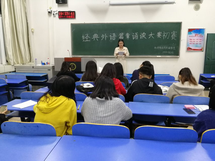 2019年11月8日晚7:00,由伟的国际1946bv官网团学会组织的经典外语篇章诵读大赛初赛在1113教室举行。本次比赛的评委有伟的国际1946bv官网团学会主席雷雨,部长韩露露、段伟涵和邱雪婷。