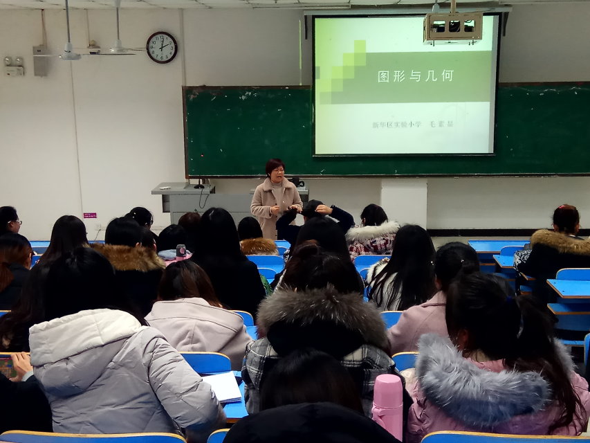 12月6日下午,伟的国际1946bv官网在图书馆L211开展了以“图形与几何”为主题的小学数学专题讲座。该讲座由平顶山市小学数学名师毛素显主讲,小学教育专业的一百多名员工参加。