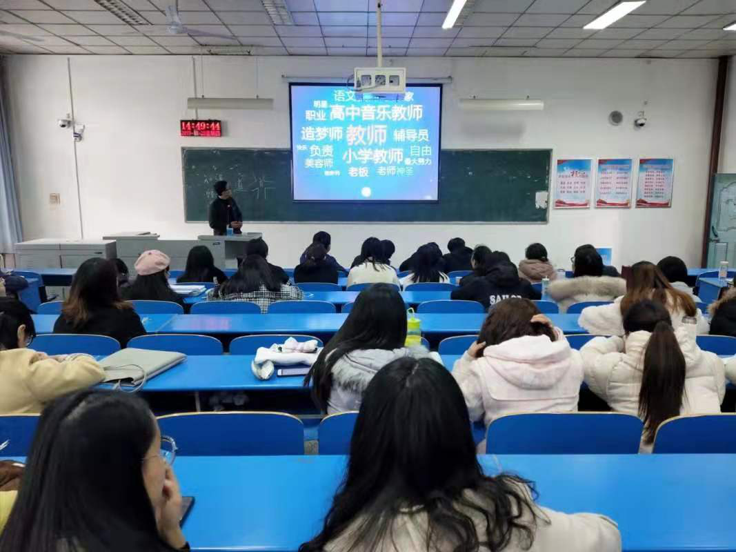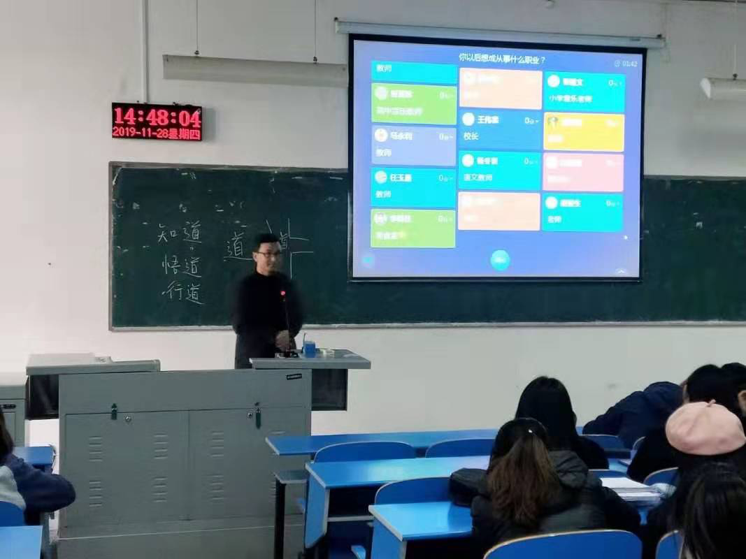 走上讲台,段博士文质彬彬、一身儒雅又不失灵动的气质即刻吸引了同学们的讲课伊始,段博士引出甲骨文“道”字,并列出“道”的字形演变,同时指出“道”的哲学含义,迅速引发了同学们的思维碰撞。随后,段博士单刀直入地为同学们讲解了教师之“道”在国家与个人层面的定位,强调了作为一名教师不仅得具备师德与能力,而且随着时代的不断发展,需保持终身学习的习惯,将言传与身教相结合,学术自由与学术规范相统一,点明要不忘初心,做员工的引路人,一路播种,一路开花。随后段博士为同学们讲述时代楷模张玉滚老师的事迹,尽管同学们对张玉滚老师的事迹耳熟能详,但每次听到他的故事,便又受到一次触动,也更加深刻地理解到作为一名教师的内涵。最后,段博士结合自己经历,提出要学会爱的教育,在体悟一个个鲜活生命的同时升华自己的一生。