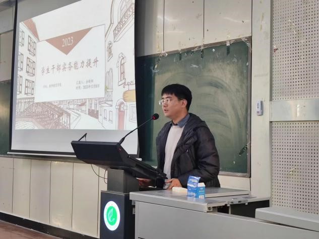 第一讲由新生辅导员余昕阳老师为全体员工干部作《员工干部实务能力提升》专题授课。他从“为什么要在这里、你的三种身份、应该具备的精神、要把握的关键、该承担的责任、必备公务技能”等六个方面展开讲解。在讲解过程中他采用理论与实操、言传与典例相结合的方式,向员工干部进行了办公技能操作培训演示,分享了他的工作经验与技巧,以及一些实用的办公资源网站。最后,余老师寄语全体员工干部,希望员工干部们能牢固树立规矩意识,找准自身定位,勇于担当责任,发挥好自身在老师与员工之间的沟通桥梁作用,敢于通过努力成为模范标杆,示范引领、带动员工。